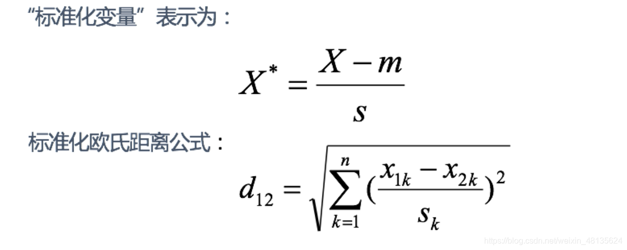 思路:既然数据各维分量的分布不一样,那先将各个分量都“标准化”到均值、方差相等。假设样本集X的均值(mean)为m,标准差(standard deviation)为s,X的“标准化变量”表示为: